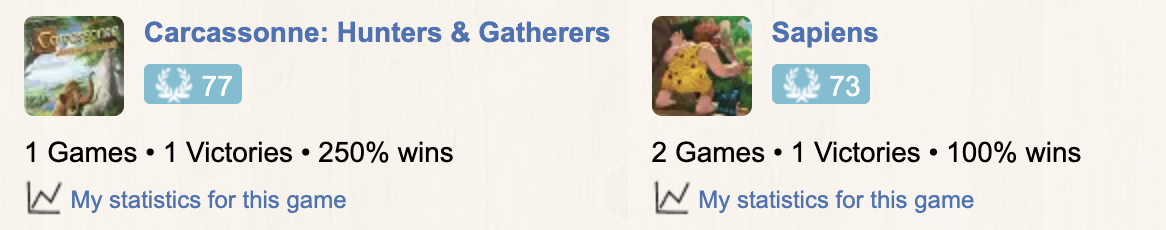 "Carcassonne: Hunters & Gatherers. 1 Games • 1 Victories • 250% wins