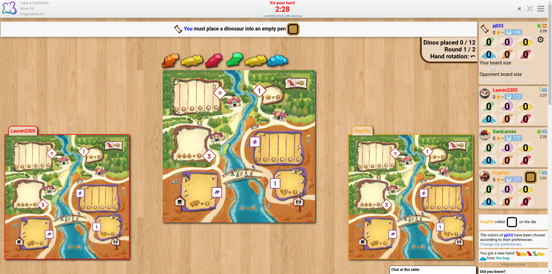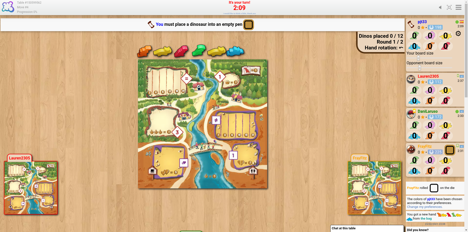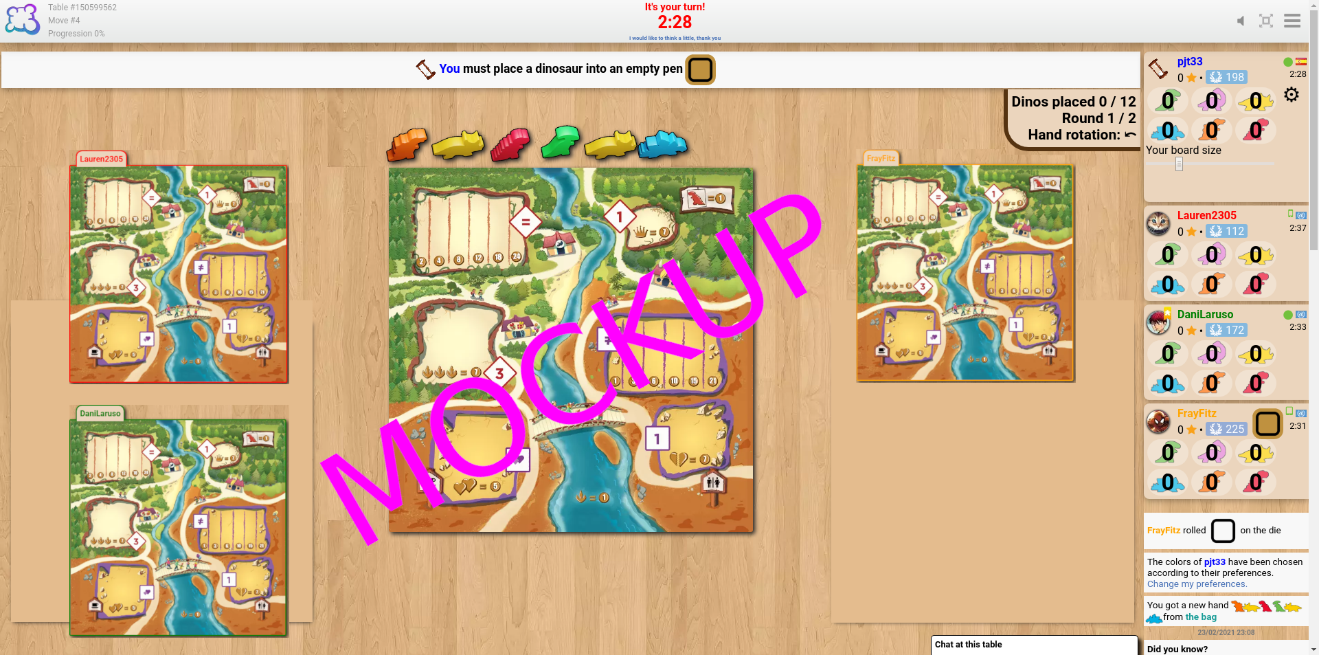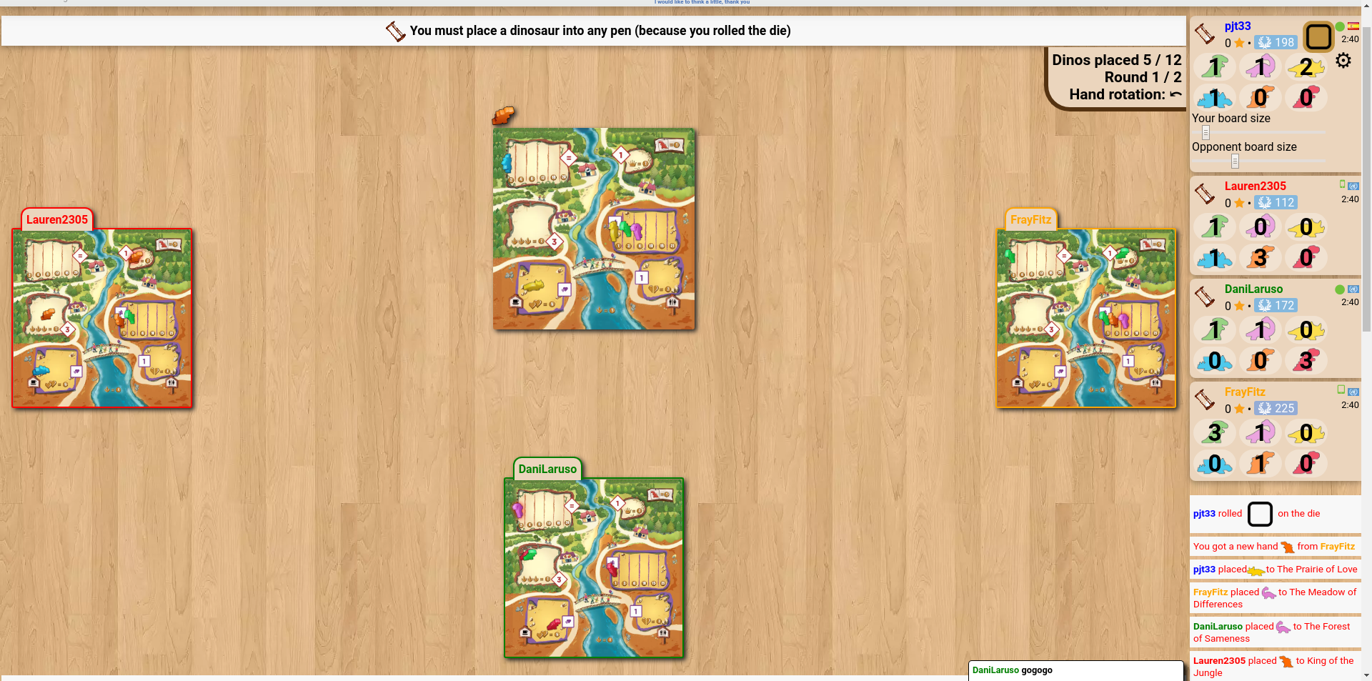 For desktop I think that it would work to have just one slider, for my own board size, and to fit the opponent boards into the left and right margins by calculating the scale factor which lets them both fit vertically, and the scale factor which lets them fit horizontally, and choosing the smaller of the two. I've made a mockup at cheddarmonk.org/forumimg/draftosaurus-mockup.png which shows how much larger the boards can be without scrolling. • Which browser are you using?